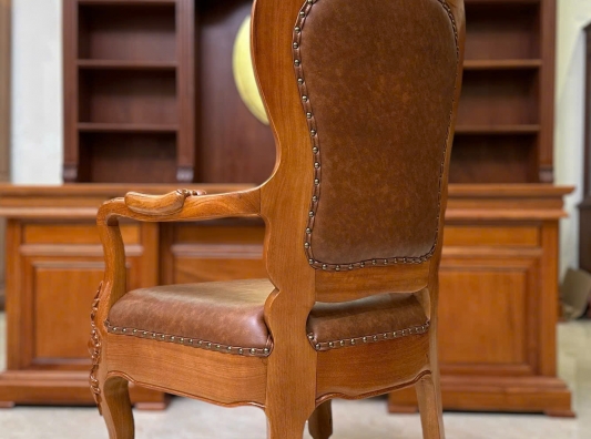 Khám phá mẫu ghế giám đốc nữ bọc da nâu cao cấp, khung gỗ Gõ đỏ sang trọng. Thiết kế tinh xảo, viền uốn lượn mềm mại, đính khuy đồng cổ điển, tôn vinh phong thái quyền lực và thanh lịch.