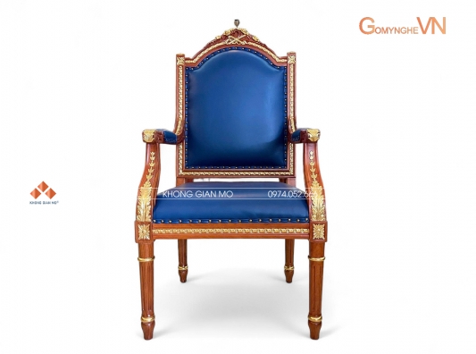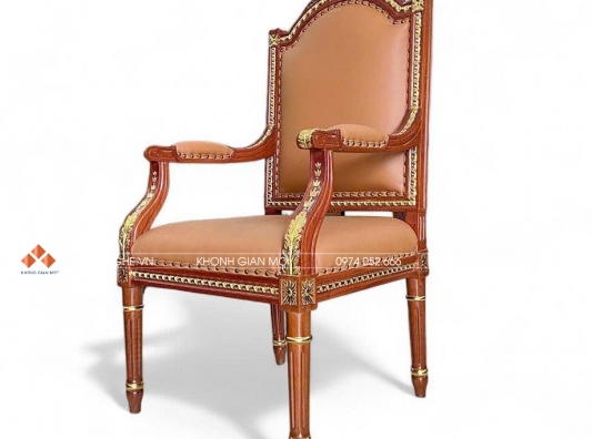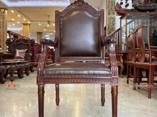 Điểm nổi bật nằm ở phần khung ghế với họa tiết hoa lá tây được đục thủ công, tạo chiều sâu và sự liền mạch trong thiết kế. Khi đặt trong không gian văn phòng, mẫu ghế mang lại cảm giác vững vàng, nghiêm túc nhưng vẫn giữ được nét tinh tế cần có.