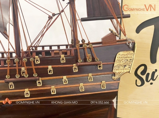 Thuyền gỗ trắc được thiết kế tinh xảo chạm khắc tỉ mỉ, tái hiện chi tiết như thuyền cổ với nhiều bộ phận, súng thần công, đài quan sát.