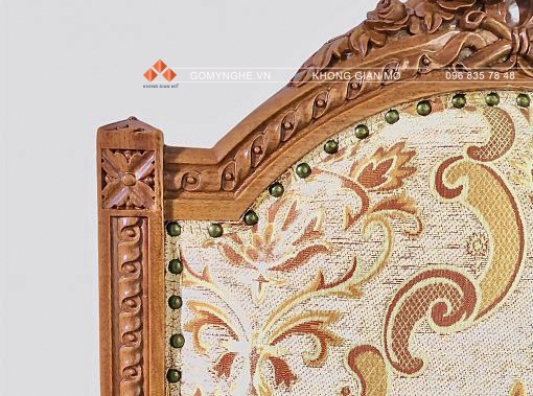 Chất liệu: gỗ gõ đỏ - vải nỉ nhập - sơn PU inchem cao cấp, dát vàng 18k đài Loan các họa tiết