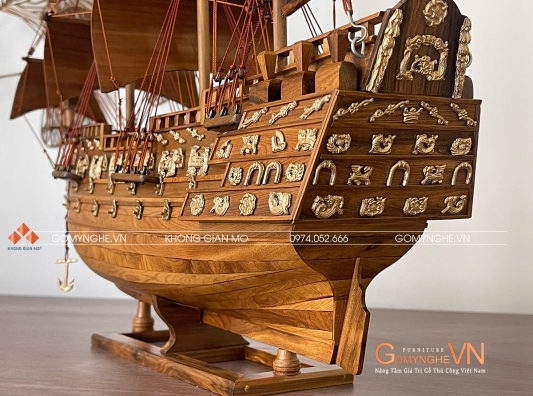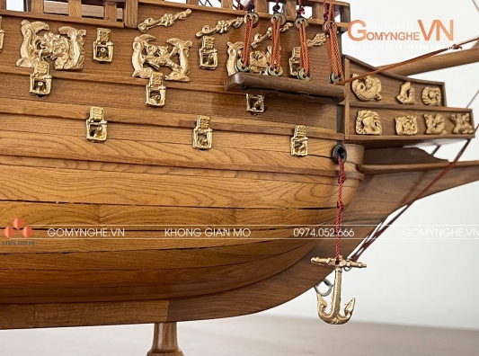 Thuyền được chế tác từ gỗ bách xanh Việt tự nhiên đã xử lý chống cong vênh, bề mặt lên màu sắc vàng nhẹ trầm ấm, nổi vân đẹp và có mùi thơm nhẹ của gỗ. Phần buồm được làm từ gỗ mỏng, uốn thủ công 100%, giữ độ cong no gió rất tự nhiên khi ánh sáng chiếu vào. Màu gỗ kết hợp với những chi tiết như lan can, họa tiết mạ đồng linh vật biển, hệ thống vũ khí bảo vệ con thuyền tạo cảm giác an toàn, sang trọng nhưng vẫn gần gũi, phù hợp với hầu hết các kiểu bàn làm việc, kệ tủ hoặc không gian trang trí văn phòng.