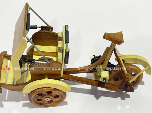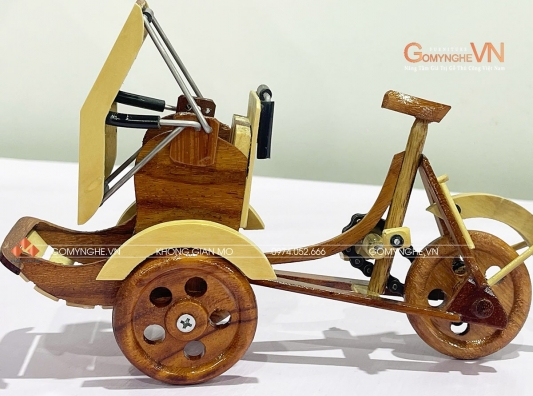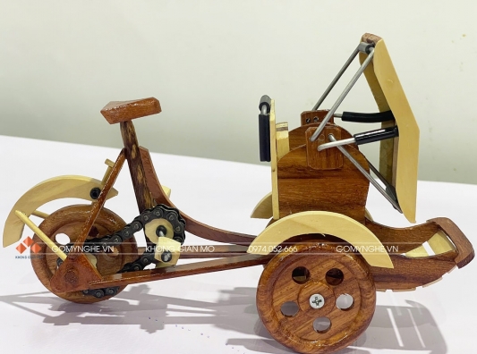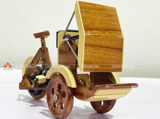 Mô hình xích lô bằng gỗ là sản phẩm decor mang đậm nét hoài niệm, tái hiện hình ảnh quen thuộc của phố phường Việt Nam những năm xưa. Được chế tác hoàn toàn thủ công từ chất liệu gỗ tự nhiên như gỗ gõ, gỗ mun hoặc bách xanh, mỗi chi tiết nhỏ như tay lái, bánh xe, bàn đạp đều được tỉ mỉ khắc chạm, thể hiện tay nghề tinh tế của nghệ nhân.